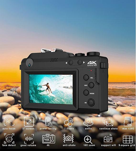 4K 48MP Vlogging Camera with WiFi, Free 32GB TF Card & Hand Strap, Auto Focus & Anti-Shake, Built-in 7 Color Filters, Face Detection, 3'' IPS Screen, 140° Wide Angle, 18X Digital Zoom - T.2